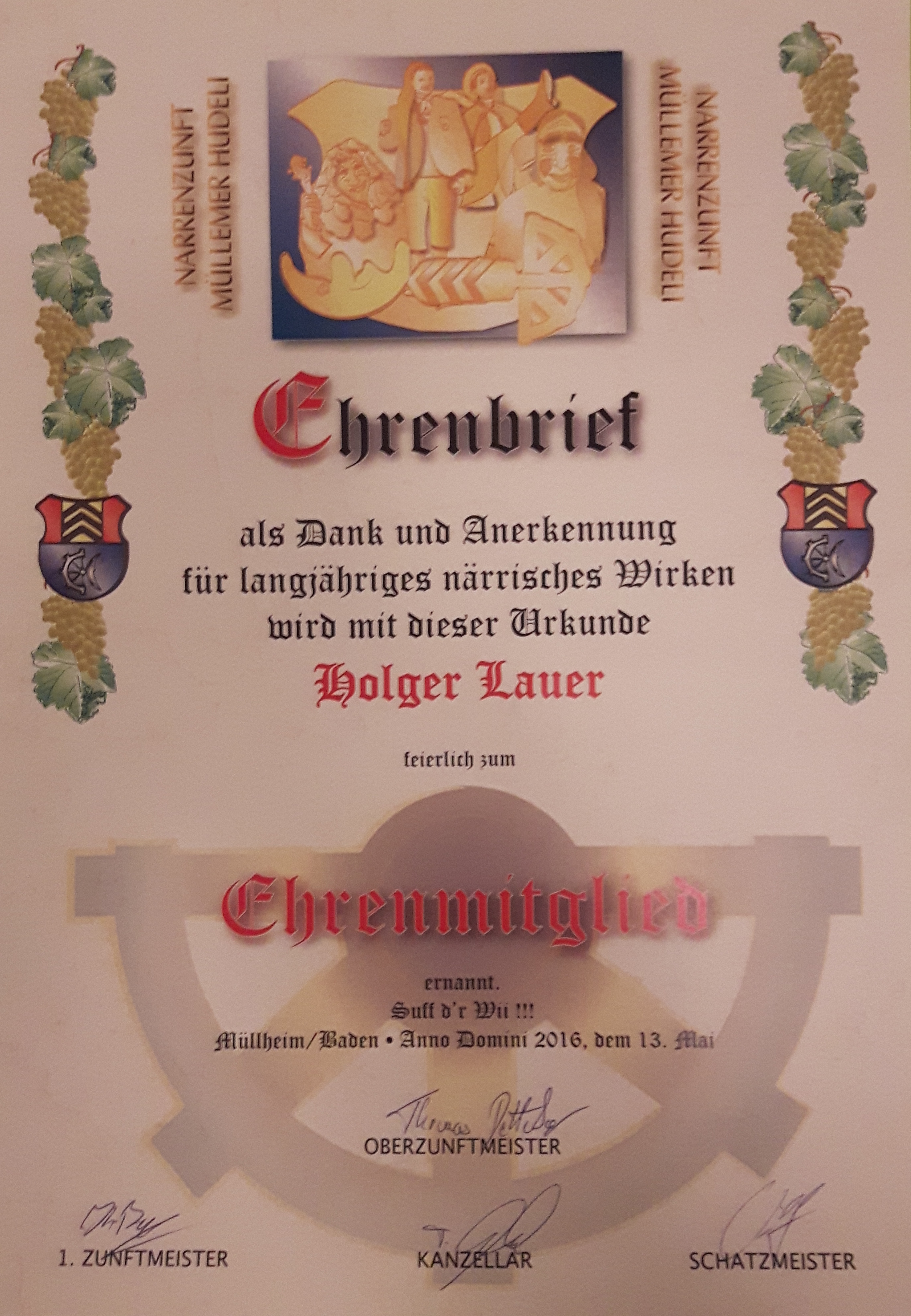 Holger Lauer, ehemalige Oberzunftmeister und heutiger Förderer und Unterstützer der Narrenzunft, wurde zum Ehrenmitglied ernannt.